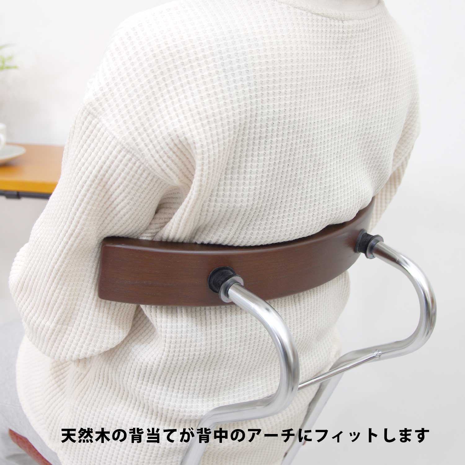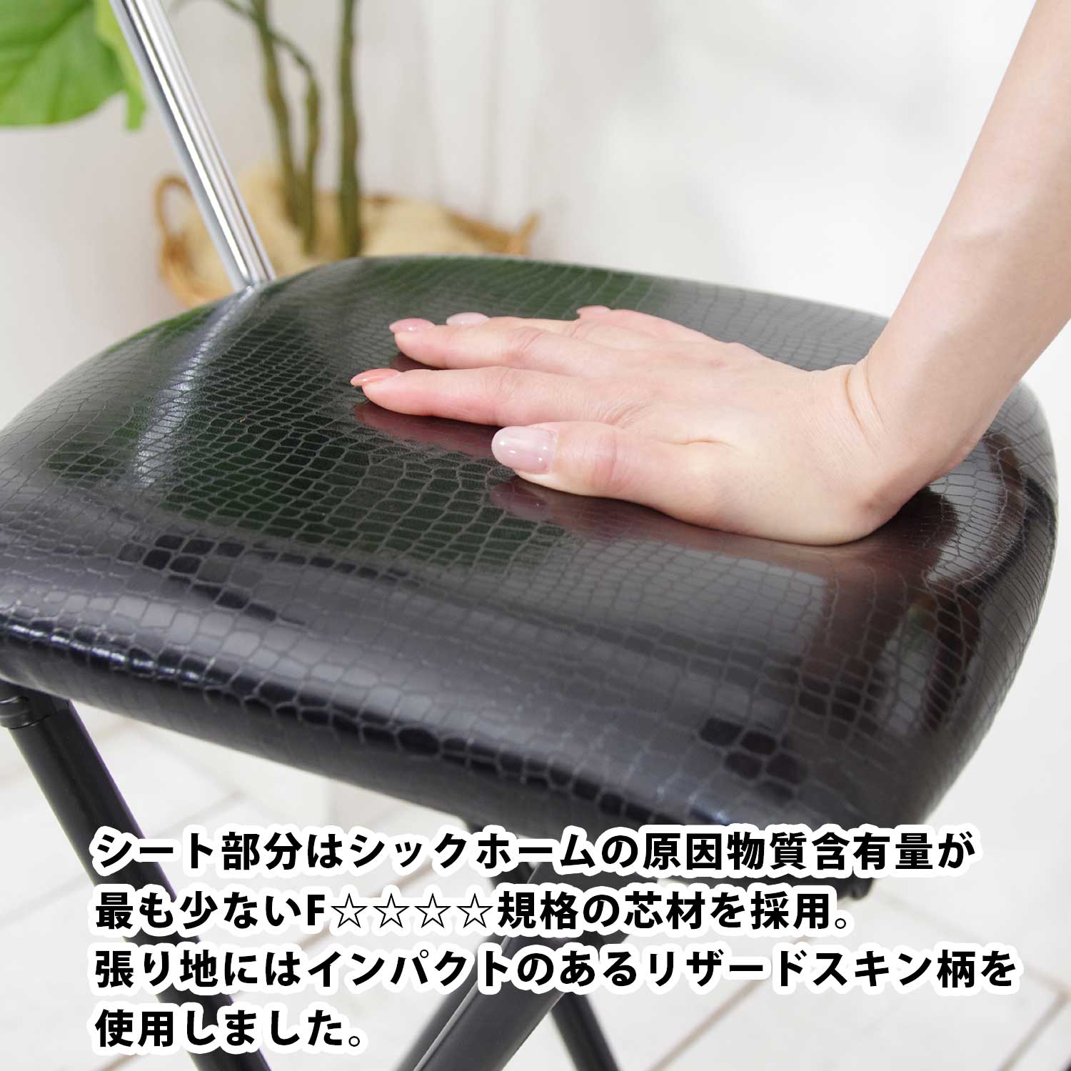 弧を描く天然木の背板は特殊ゴムにより、上体の動きに合わせてスウィングします。シート生地には高級感漂うリザーと柄。折畳時の指挟み事故を防ぐスライドリング方式を採用しております。
